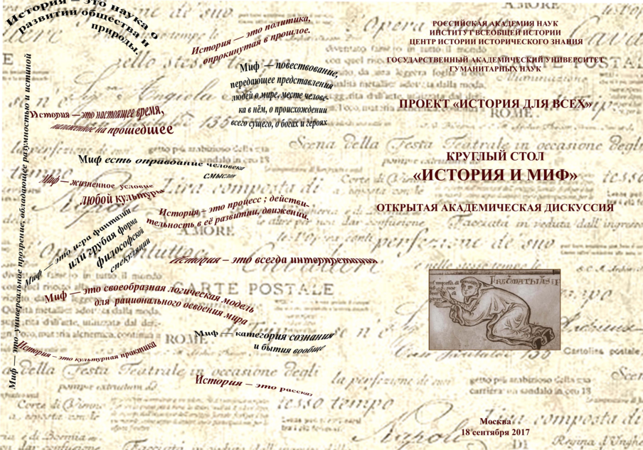 18 сентября 2017 года Центр истории исторического знания ИВИ РАН проводит Круглый стол по теме «ИСТОРИЯ И МИФ».