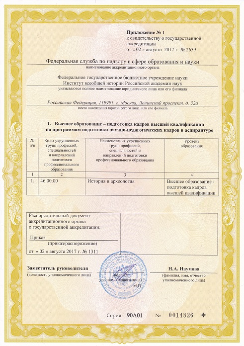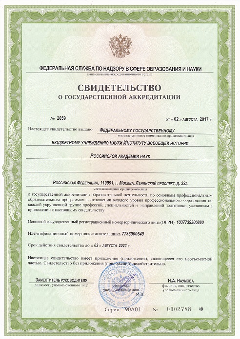 Институт всеобщей истории РАН получил государственную аккредитацию программы аспирантуры по направлению 46.06.01 - Исторические науки и археология - что является признанием качества образовательного учреждения и его соответствия стандартам высшего образования РФ.