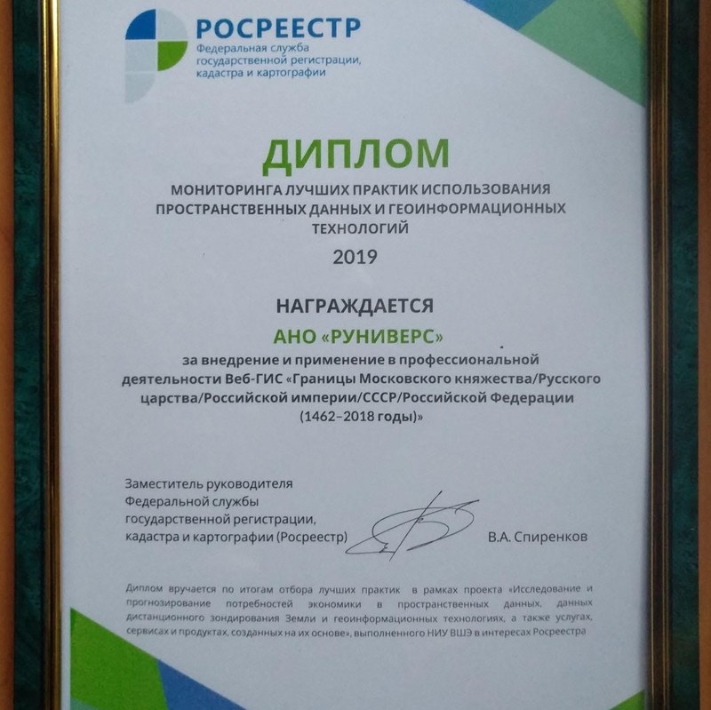 Сразу два проекта, разработанные в недрах Лаборатории исторической геоинформатики ИВИ РАН, отнесены Федеральной службой государственной регистрации, кадастра и картографии “Росреестр” к числу “лучших практик” применения ГИС-технологий в науке (https://pd.gosreforma.ru/conference). Всего в разных сферах по результатам анкетирования выделено 15 “лучших практик”, включающих проекты по геологии, метеорологии, картографии, управлению геоданными, недропользованию, эпидемиологии (https://pd.gosreforma.ru/practices/other/).