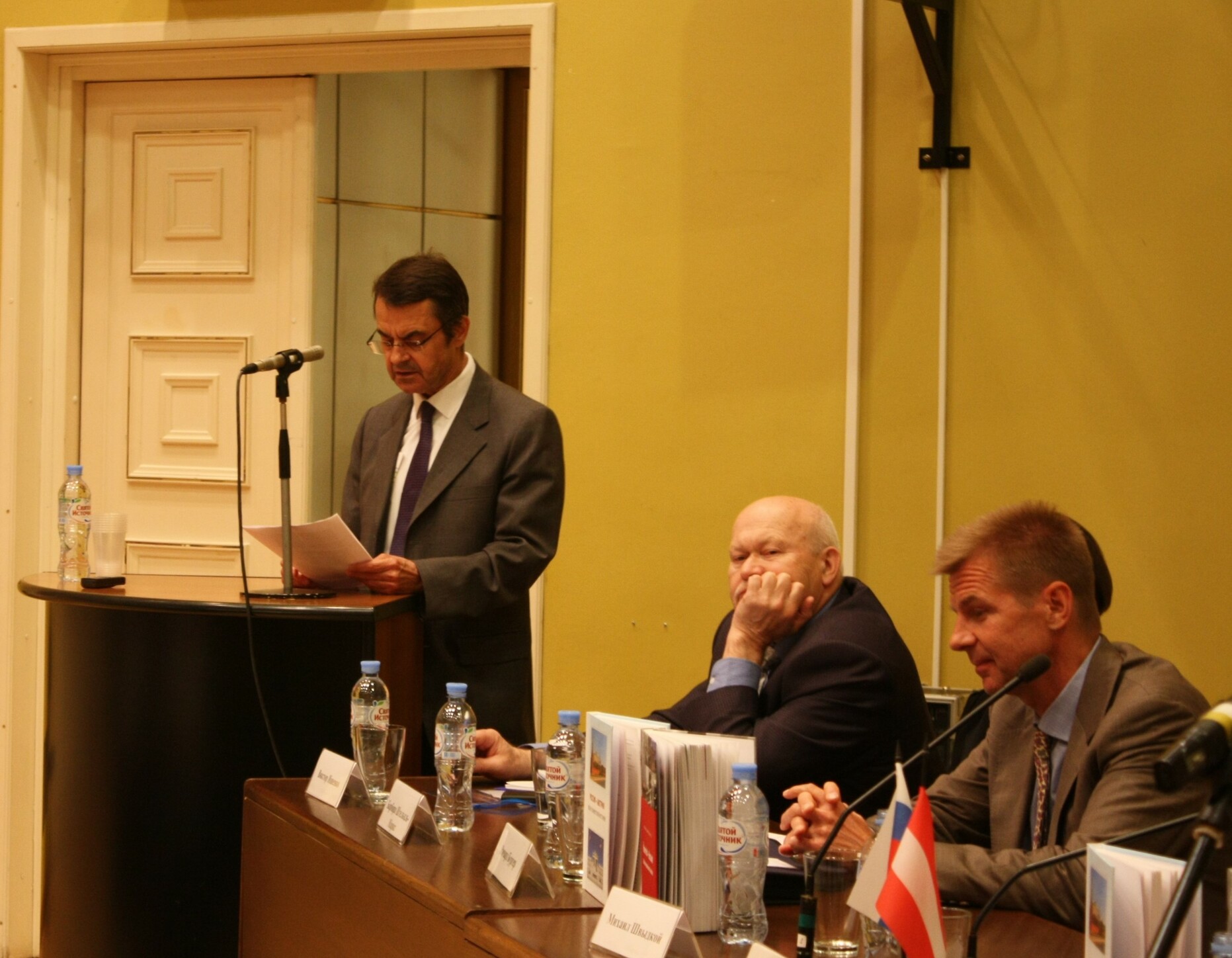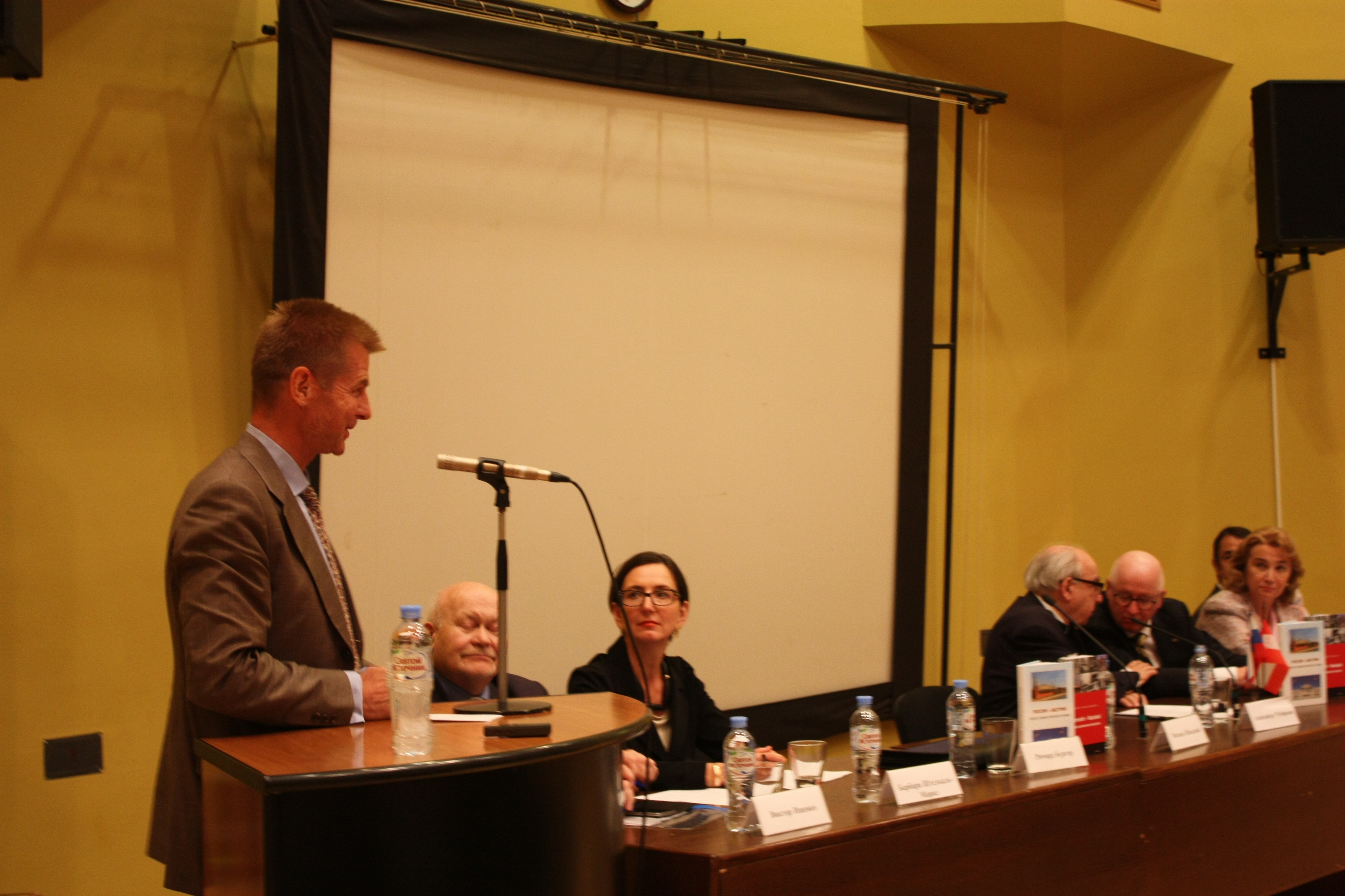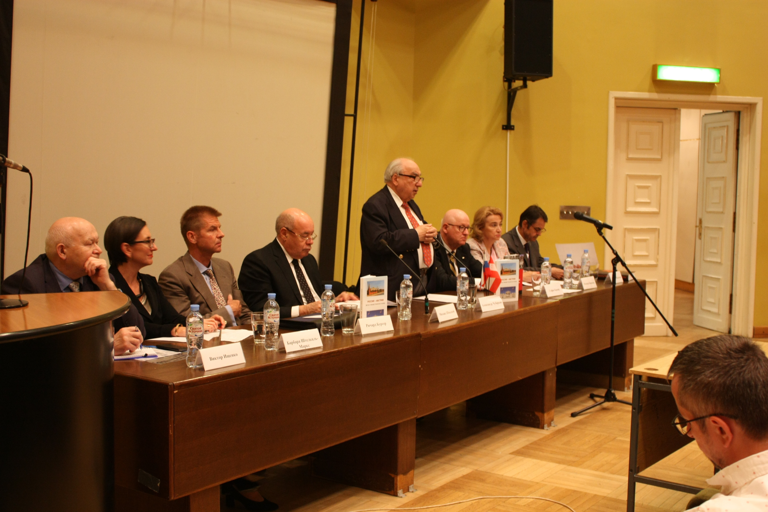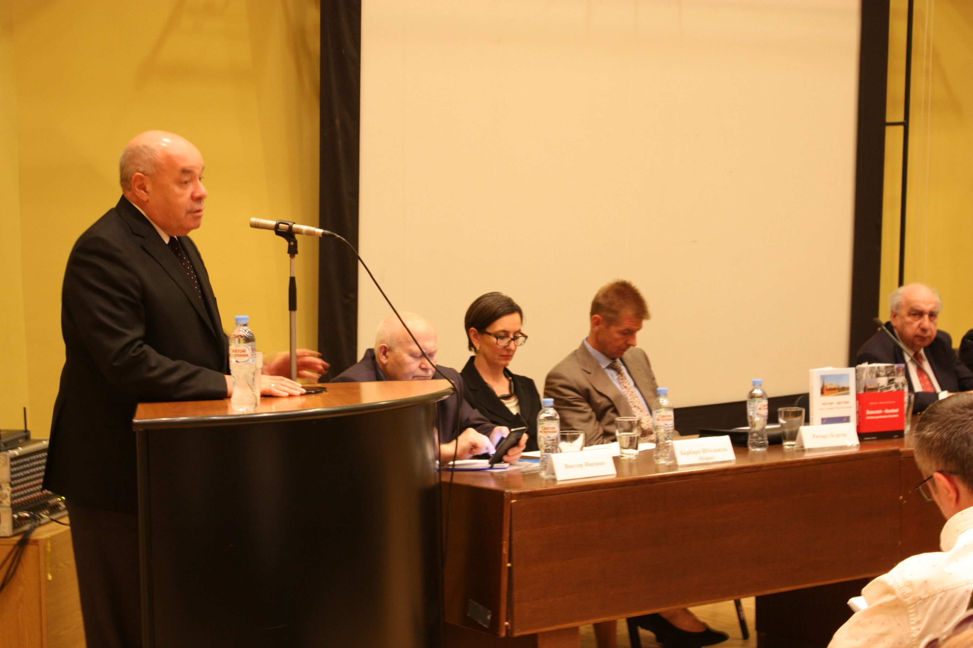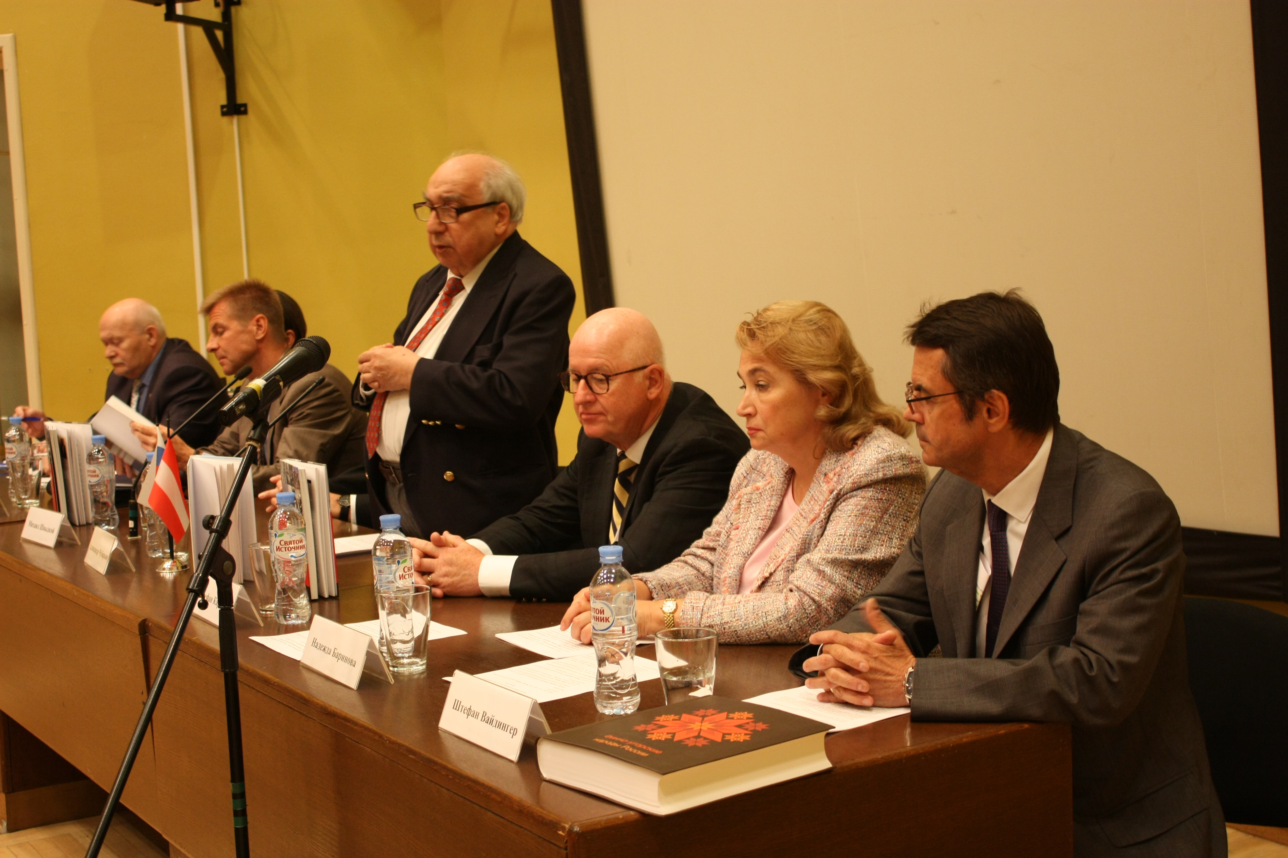 28 мая 2018 г. в Институте всеобщей истории РАН состоялась презентация книги «Россия – Австрия: вехи совместной истории», вышедшей в свет на русском и немецком языках. Издание, подготовленное в рамках деятельности Российско-австрийской комиссии историков, предлагает общий взгляд ученых обеих стран на события совместной истории – с момента установления первых контактов в конце XV в. до наших дней. Образовательный проект, в котором приняли участие 26 специалистов, формировался как пособие для учителей истории средних школ и гимназий обоих государств, для студентов-историков и одновременно с надеждой на то, что он будет интересен и более широкому кругу читателей. Книга продолжает серию аналогичных изданий, ранее подготовленных Институтом всеобщей истории РАН совместно с учеными Германии и Польши. Презентацию открыл ответственный редактор книги – научный руководитель Института всеобщей истории РАН, сопредседатель Российско-австрийской комиссии историков академик А.О. Чубарьян. В своем выступлении он отметил высокий уровень взаимного доверия между учеными России и Австрии, позволяющего им на протяжении многих лет реализовывать различные исследовательские и публикационные проекты, например, «Красная Армия в Австрии в 1945–1955 гг.», «Пражская весна 1968 г.», «Венская встреча Н.С. Хрущева и Дж.Ф. Кеннеди 1961 г.», «Падение коммунистических режимов в Восточной Европе», а теперь и значимый образовательный проект. Накануне официального визита Президента Российской Федерации В.В. Путина в Австрию, который состоится 5 июня, выход в свет книги, посвященной истории двусторонних отношений, имеет особое значение, в том числе и в международном контексте. Второй ответственный редактор книги профессор Стефан Карнер, сопредседатель Комиссии с австрийской стороны, основатель Института по изучению последствий войн имени Людвига Больцмана, подробно рассказал о структуре книги, остановившись на ключевых моментах в истории российско-австрийских отношений, а также поблагодарил российских коллег за многолетнее сотрудничество, вехой в котором стал выход русскоязычного и немецкоязычного изданий книги. Специальный представитель Президента Российской Федерации по международному культурному сотрудничеству М.Е. Швыдкой подчеркнул, что выход в свет такого рода изданий является событием не только для академического сообщества, поэтому важно придать ему более широкий общественный резонанс: молодые люди в нашей стране и за ее пределами должны знать, что, помимо конфликтов и противоборства, существует и сотрудничество, весьма успешное. В презентации приняли участие и представители дипломатического корпуса в Москве. Полномочный министр Австрийской Республики Штефан Вайдингер, коснувшись сложностей, существующих во взаимоотношениях между Россией и Европой, отметил роль Австрии как «наводчика мостов»: когда не работают политические инструменты, необходимо применять «мягкую силу» – контакты в области науки и культуры, удачным примером которой служат представленные на презентации книги. Глава Отдела науки и культуры Представительства Европейского Союза в Российской Федерации Ричард Бургер обратил особое внимание слушателей на то, что понимание исторических процессов крайне необходимо для выстраивания двусторонних отношений, подчеркнув ва