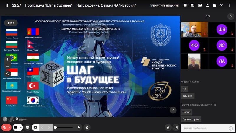 4 и 7 апреля 2022 года на базе Института всеобщей истории РАН прошла историческая секция Всероссийского форума научной молодежи «Шаг в будущее», приуроченная к 175-летию со дня рождения Н.Е. Жуковского. В текущем году по решению организаторов форума и в связи с сохранением тяжелой эпидемиологической ситуации и связанных с ней ограничений финал вновь прошел в формате Всероссийского дистант-форума. Мероприятиясекции проходили в форме онлайн-конференции на платформе Webinar.ru.